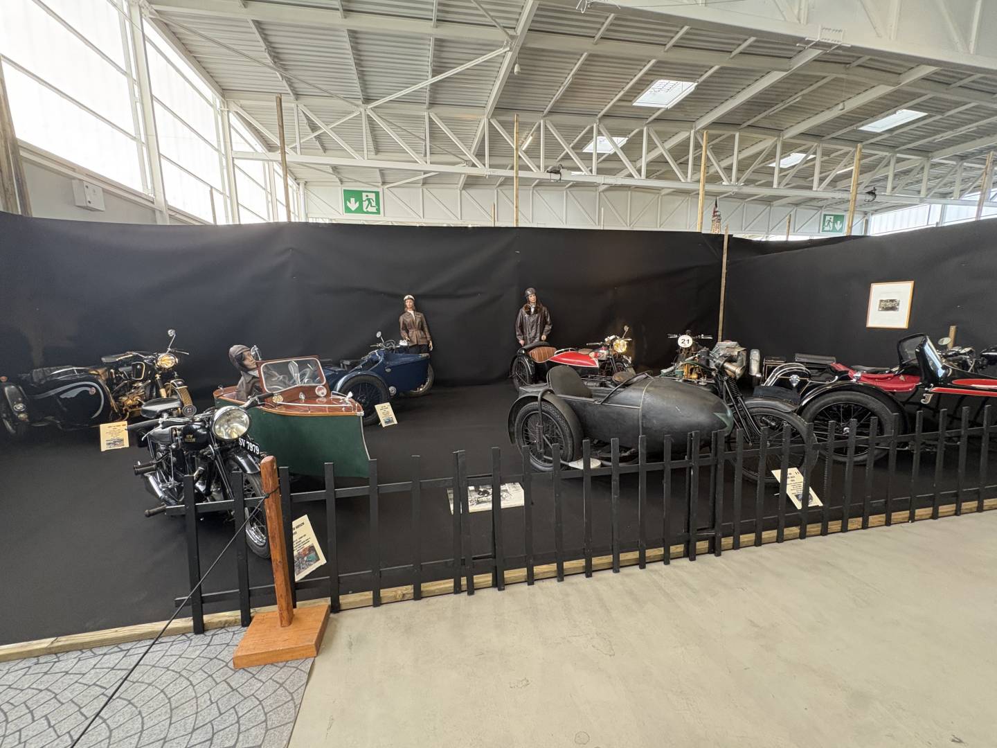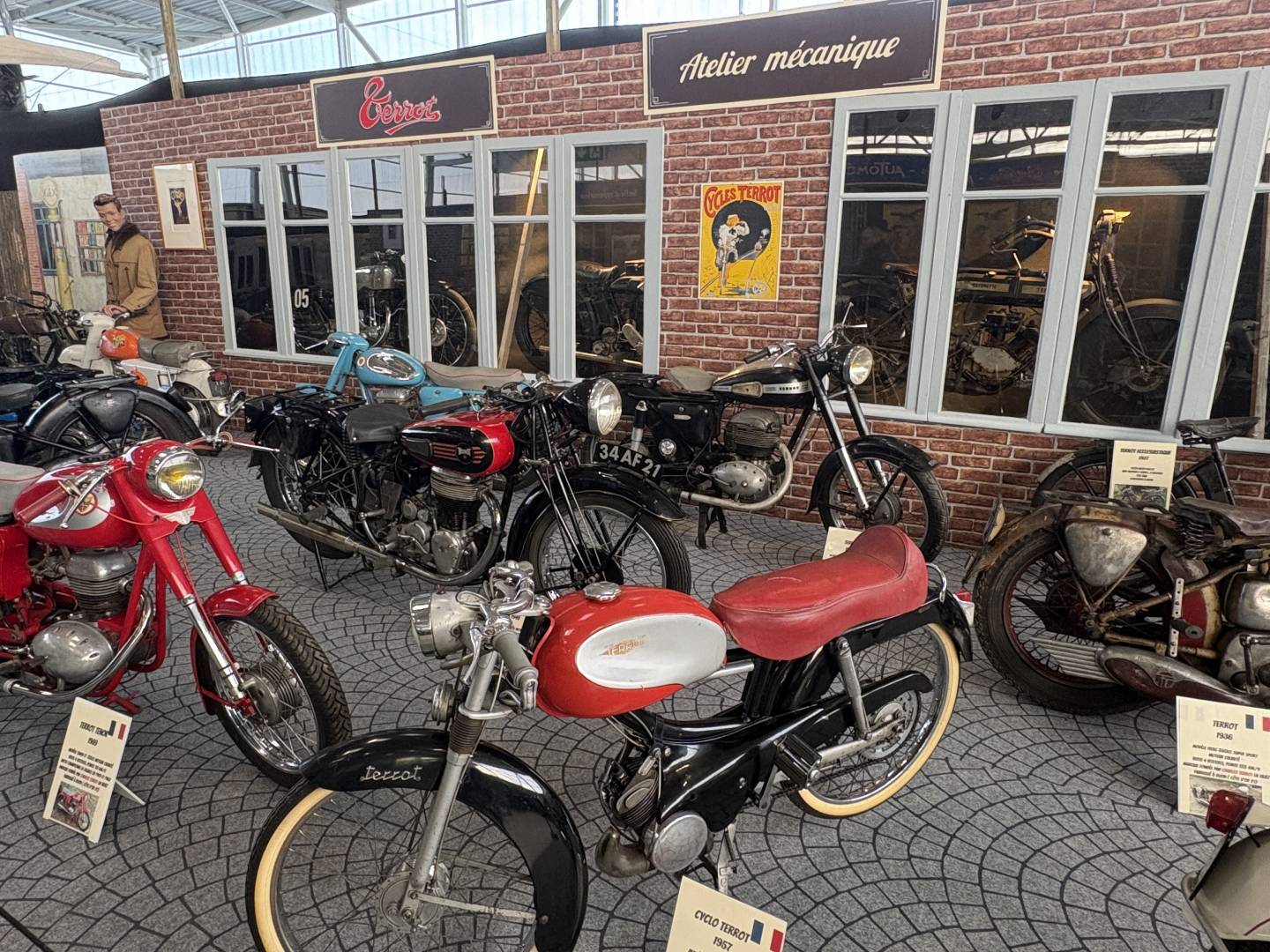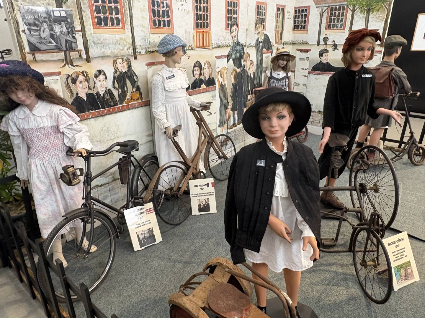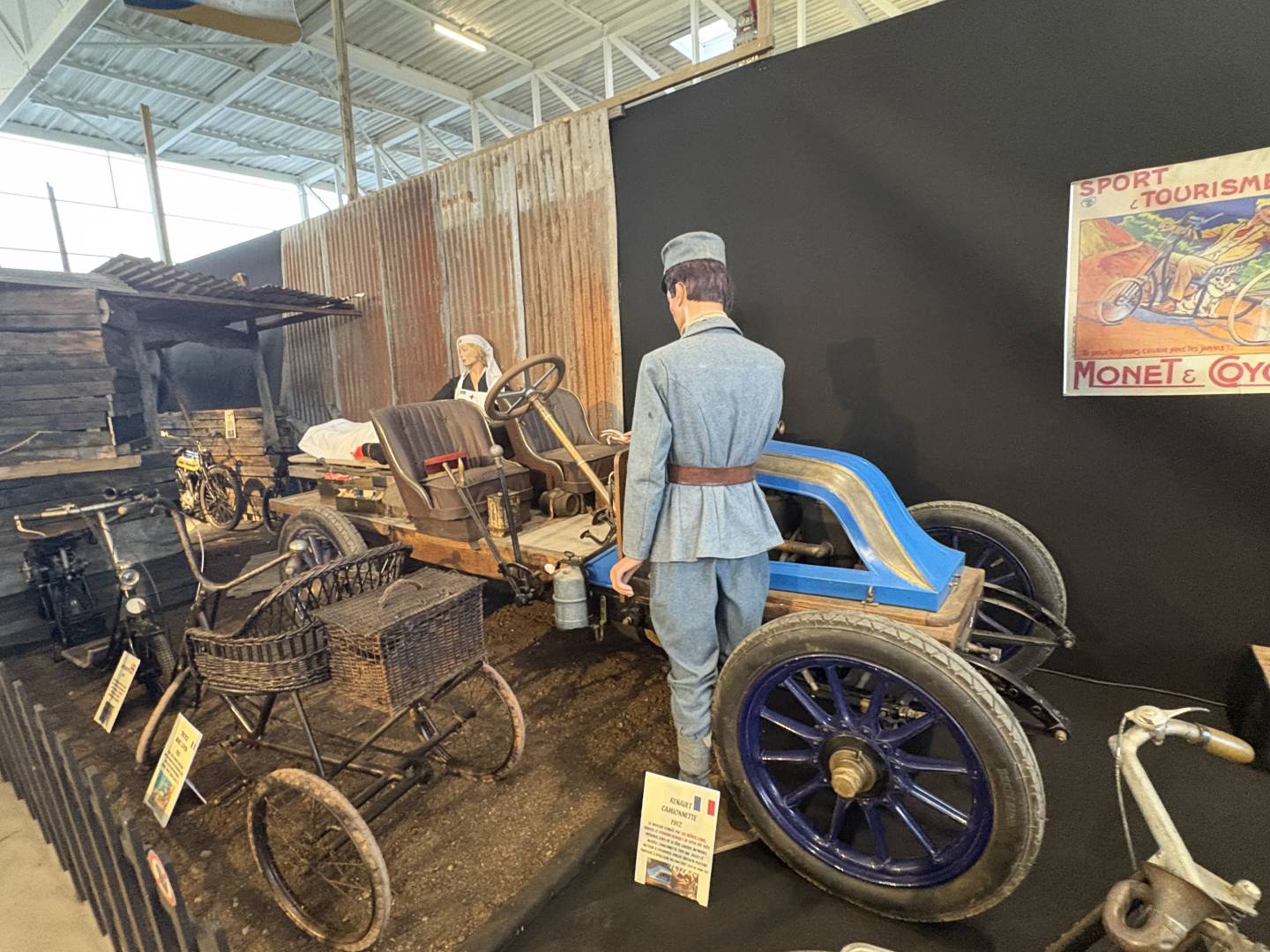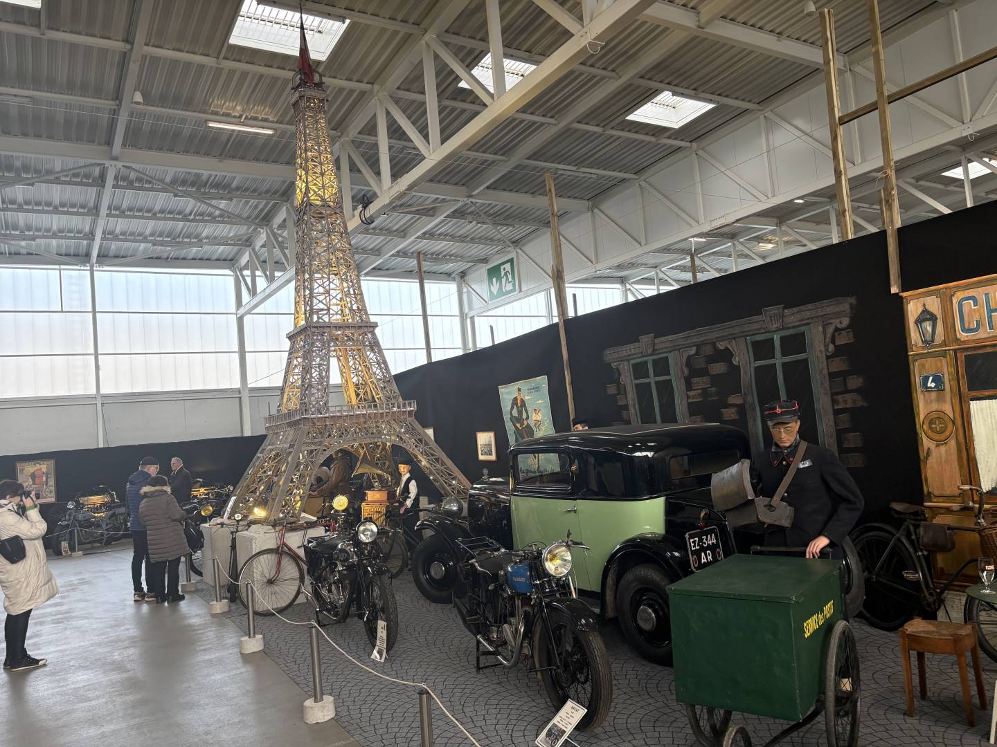 Château-Gontier le 23 Janvier Je suis allé aujourd'hui voir cette magnifique exposition du collectionneur Jean Luc Gaignard à Château-Gontier en Mayenne. Elle a commencé le 14 Janvier et finit le 1er Mars. Sur 2800 m2 plus de quatre cents machines, cela retrace 200 ans d'histoire du début de la bicyclette aux motos des années 60. C'est la première vois que sa collection, qu'il a accumulé depuis 50 ans, est visible dans de magnifiques décors avec des mannequins en costume. A ne pas rater. Hâtez-vous. L'exposition rencontre un très grand succès, il est prudent de réserver, surtout les week-end. Sur le site, ils mettent 1h30 de visite, comptez plutôt 2h30. Je vous mets juste quelques photos d'ensemble.